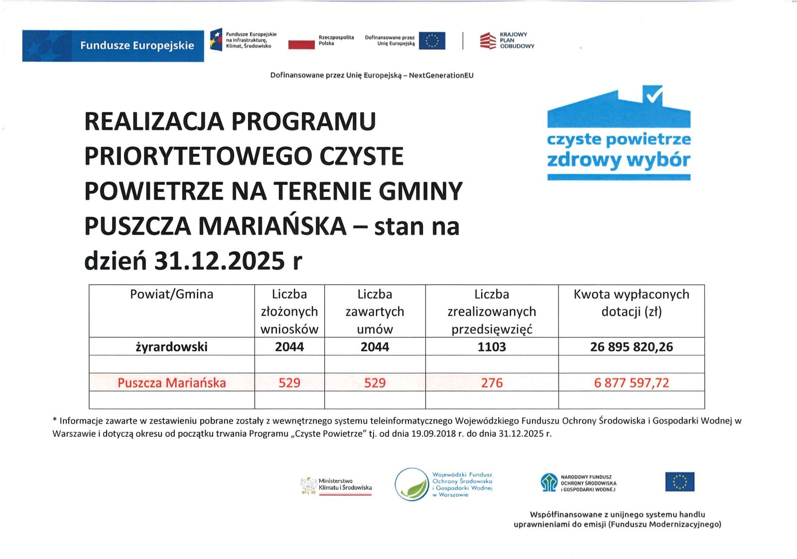 Realizacja Programu Priorytetowego Czyste Powietrze na terenie Gminy Puszcza Mariańska – stan na dzień 31.12.2025 r.